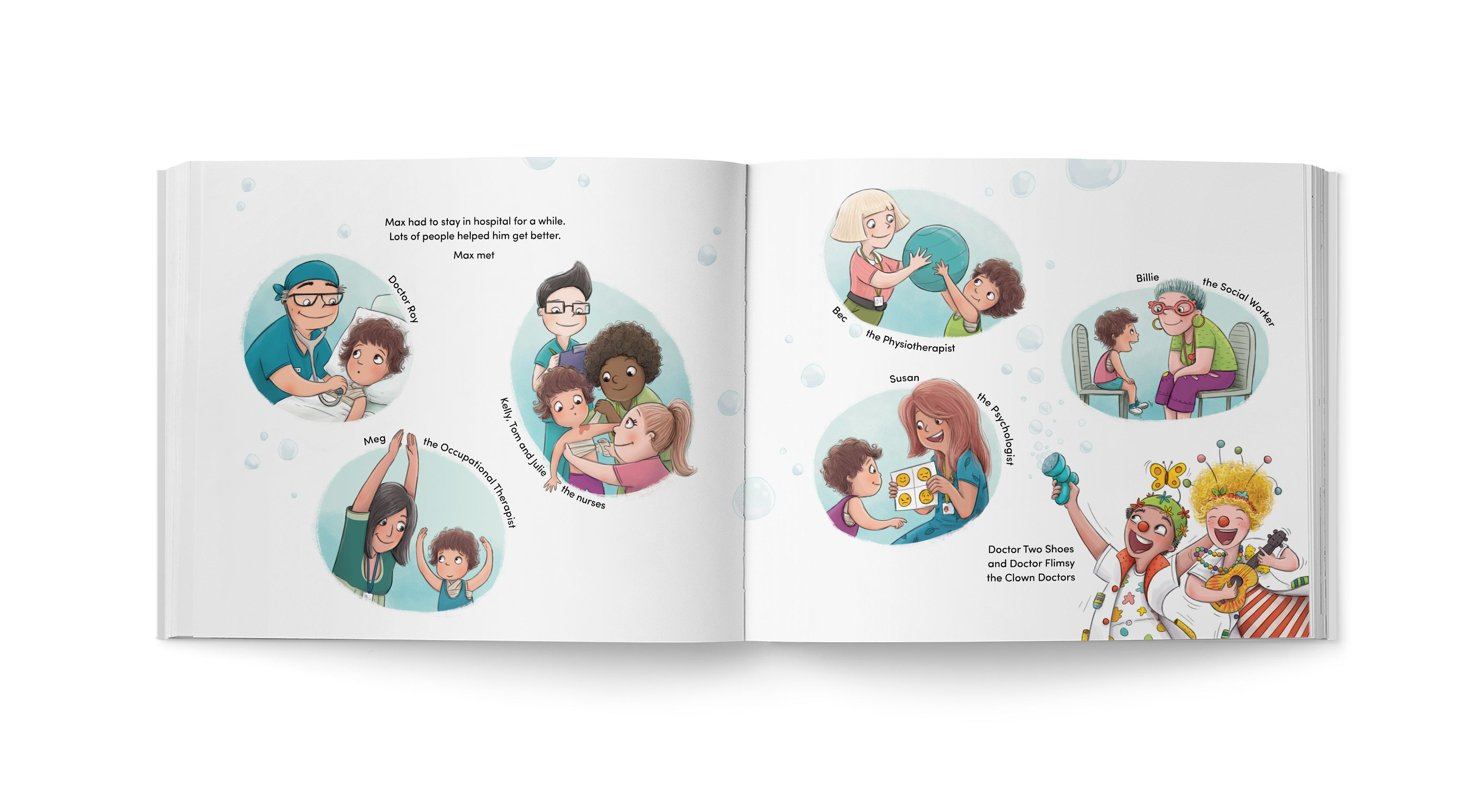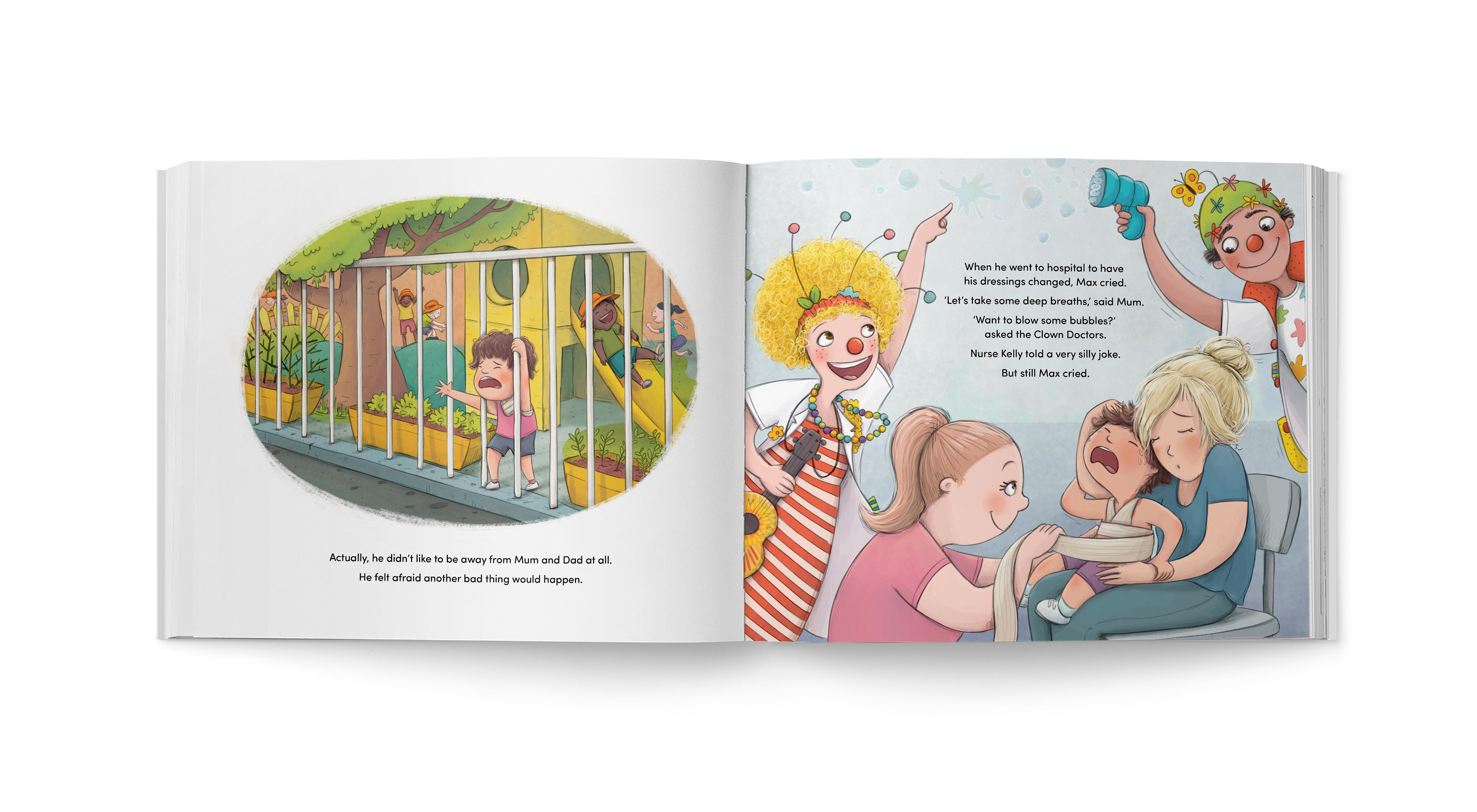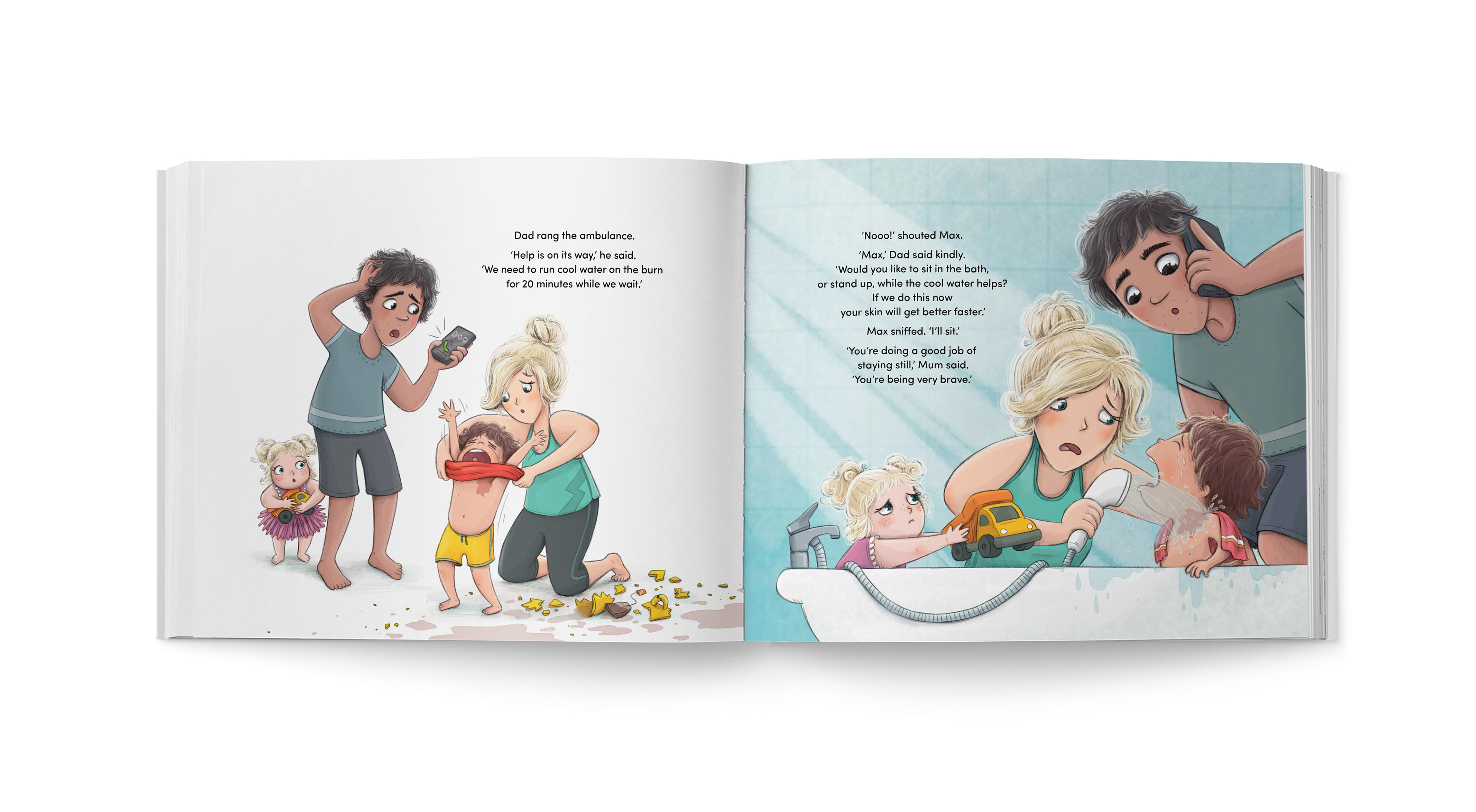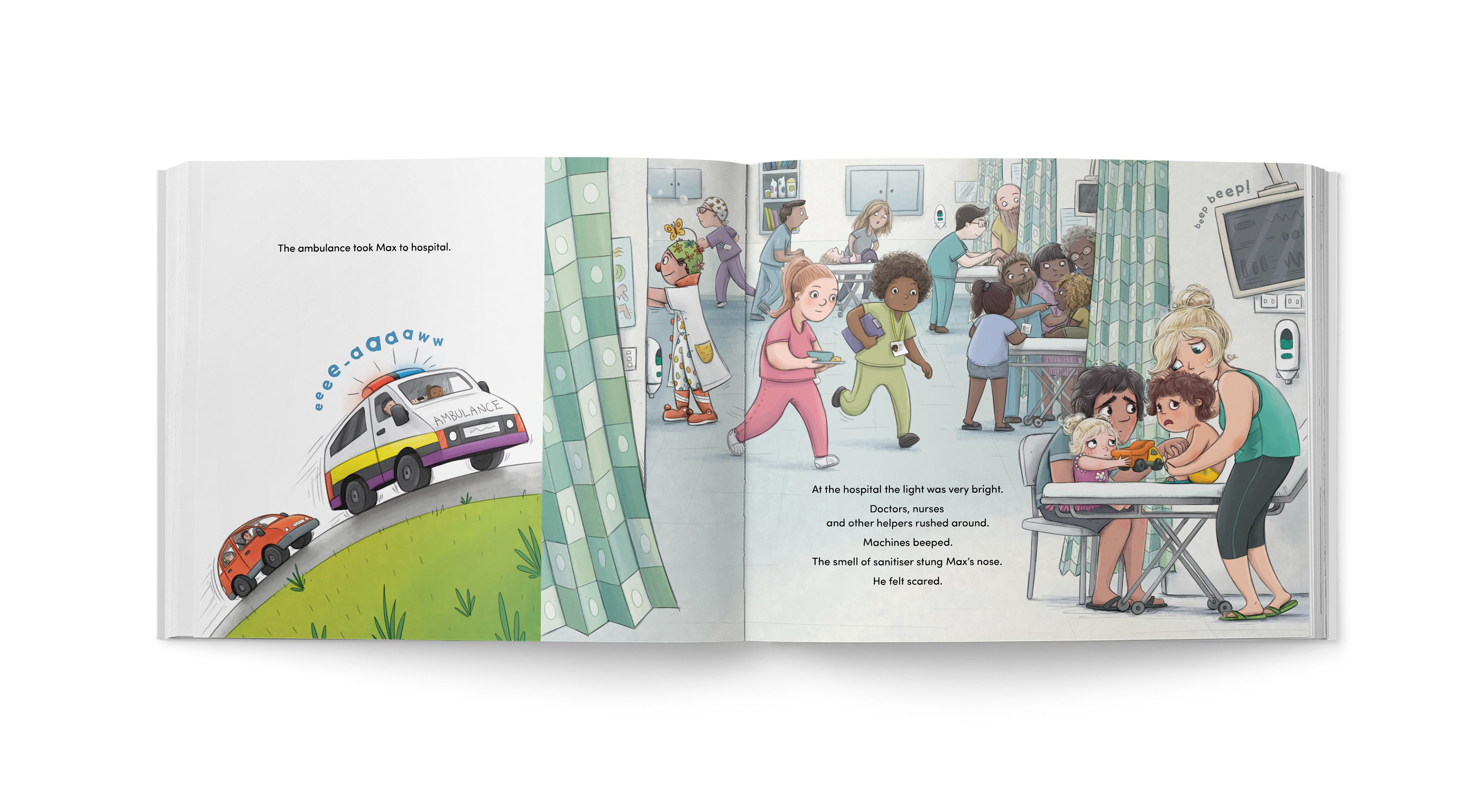 Oh no! Max has been burnt by hot tea. Everyone at the hospital does something different to help. But there's someone who does a very special job, helping Max be brave.